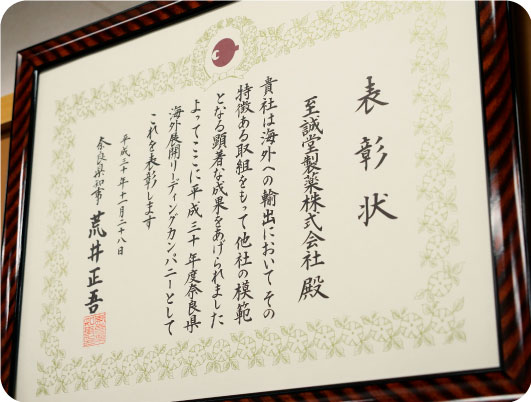 海外輸出に取り組み、成果を上げている事業所として、「奈良県海外展開リーディングカンパニー(輸出)」の表彰を受けました(2018年度)。各種のISO規格やPIC/S GMPなど、国際的な基準に準拠した製品づくりや品質管理を行っています。